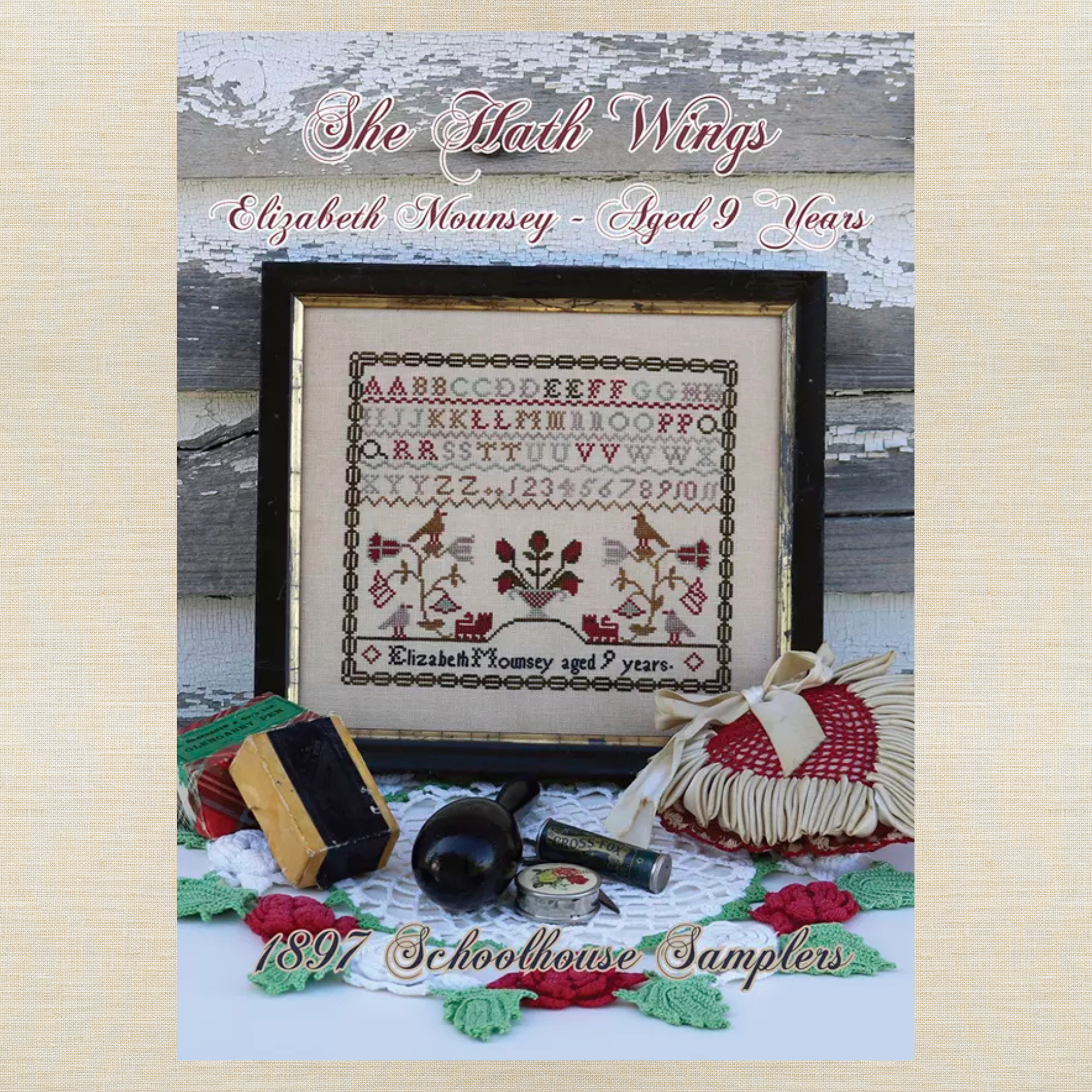1897 Schoolhouse Samplers - She Hath Wings: Elizabeth Mounsey ~ Aged 9 Years - Physical Chart and/or Roxy Floss