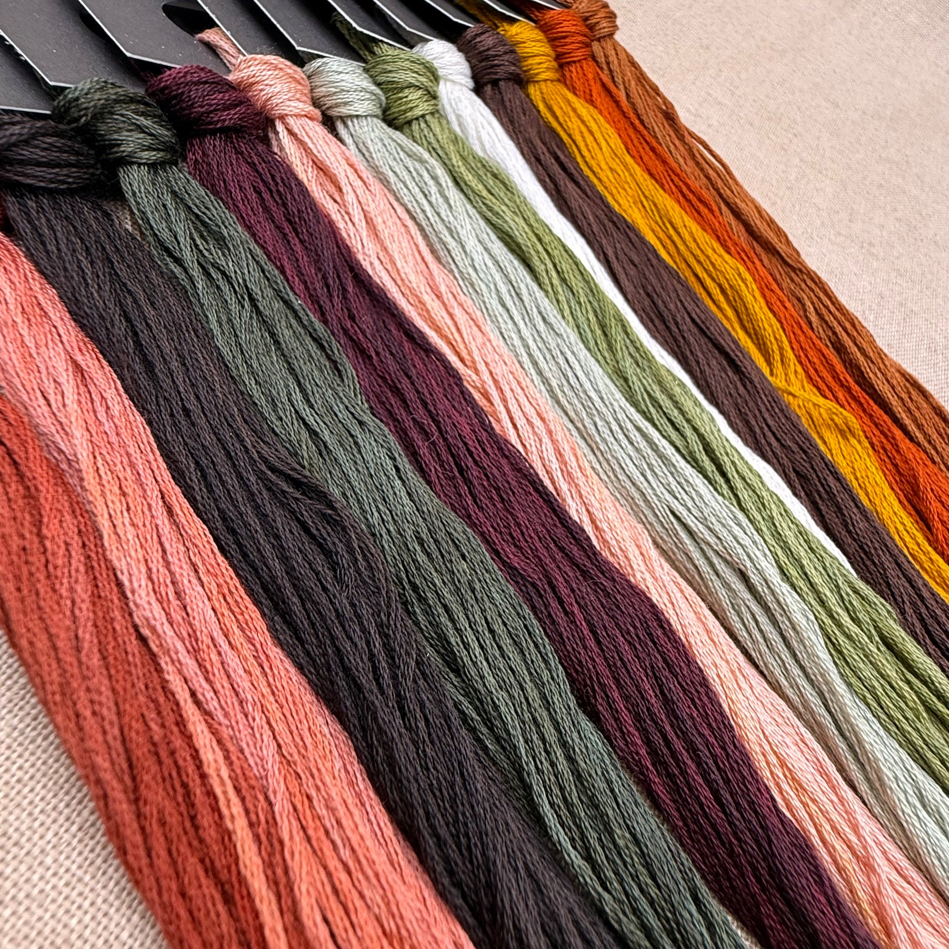 Floss colours included are: Tart, Geranium, Baker's Block, Dark Sage, Thursday, Salmon, Early Harvest, Smells Like Money, Legend-Dairy, Espresso, Curry Powder, Rust in Time, Autumnal