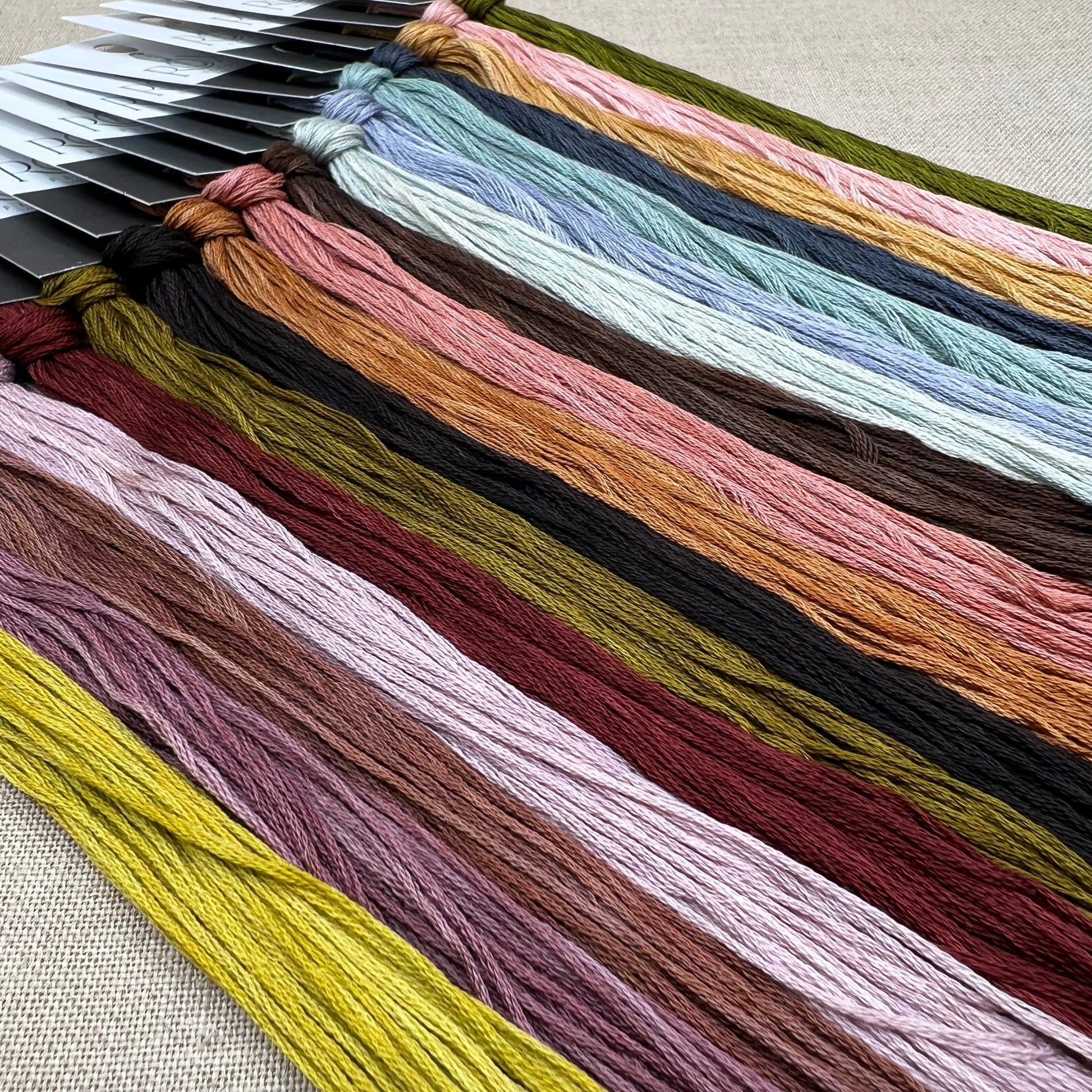 Floss colours included are: Verd's the Word, Sugar Plum, Kahlua, Prose, Chambord, Whole Grain, Brunette, Anne, Prima Donna, Plum Pudding, Powdered Up, Ice Rink, Cool Breeze, Lead It Be, Hay Bale, The Final Moss, and Piglet