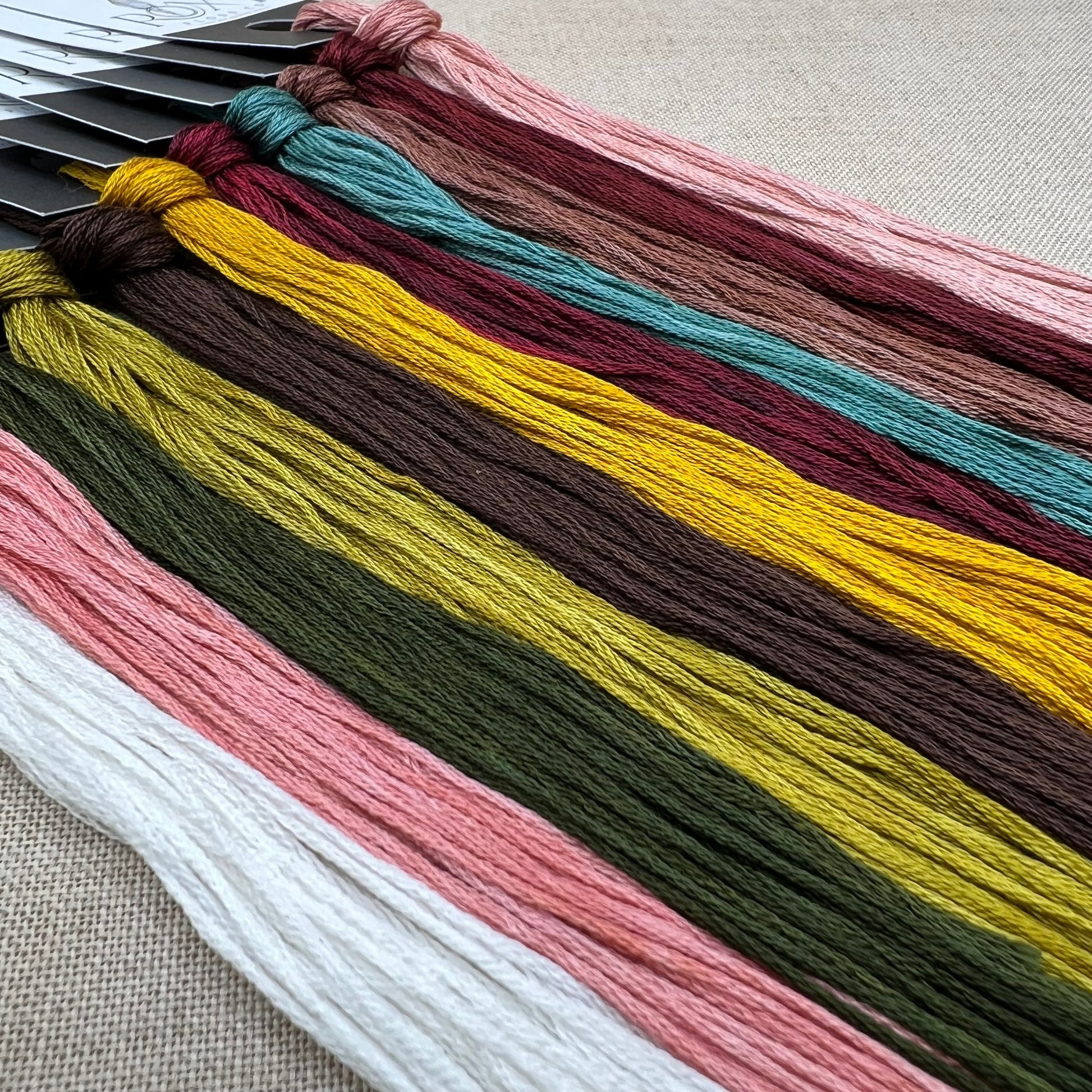 Floss colours included are: Legend-Dairy, Oink, Spinach, Serpent, Chocolate Ganache, Curry Powder, Tuesday, Blue Spruce, Kahlua, Chambord, and Piggy Bank