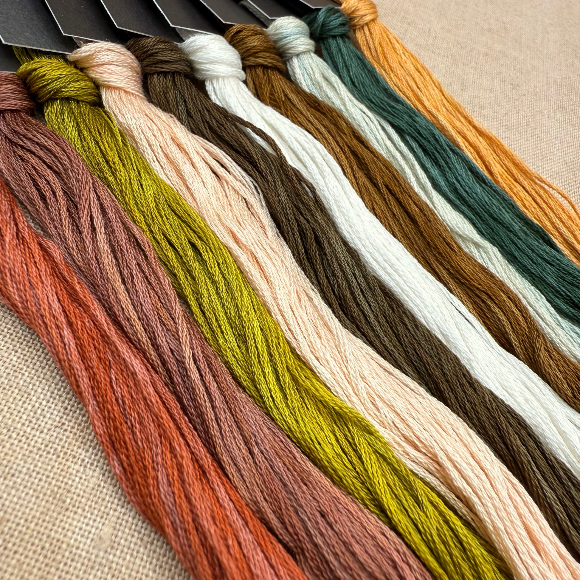 Floss colours included are: The Occasion, Frangelico, Monstera, Moscato, Dirty Dancing, Legend-Dairy, Ochre, Powdered Up, The Wiz, Hive Mind