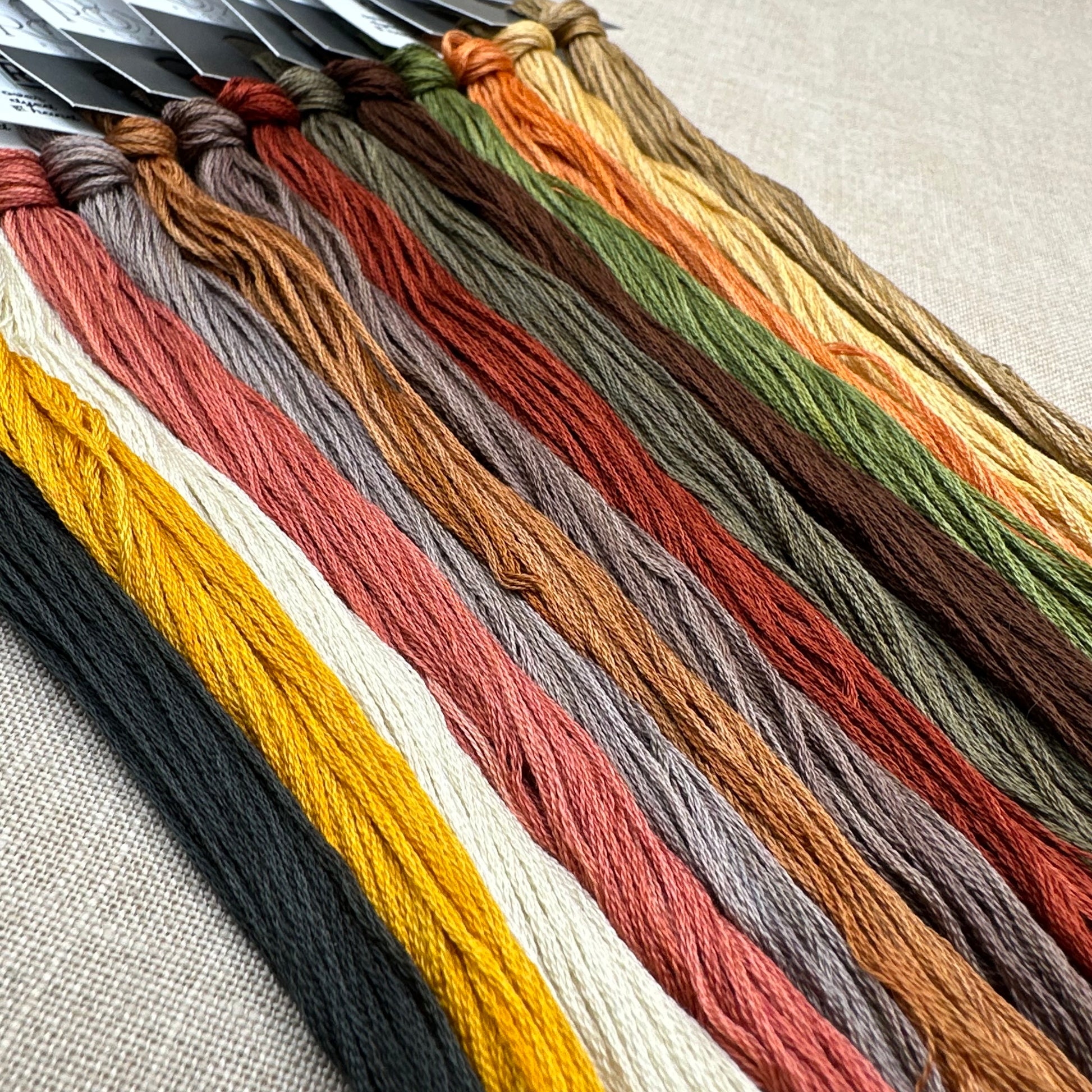 This conversion comes with 14 skeins of Roxy Floss in the colours: Carbon, Medallion, Almond, Craisins, Fossil, Anne, Hickory, Tart, Dirty Martini, Chocolate Ganache, Lawn & Order, Rhymes with Orange, Haystack, and Creme Brulee.