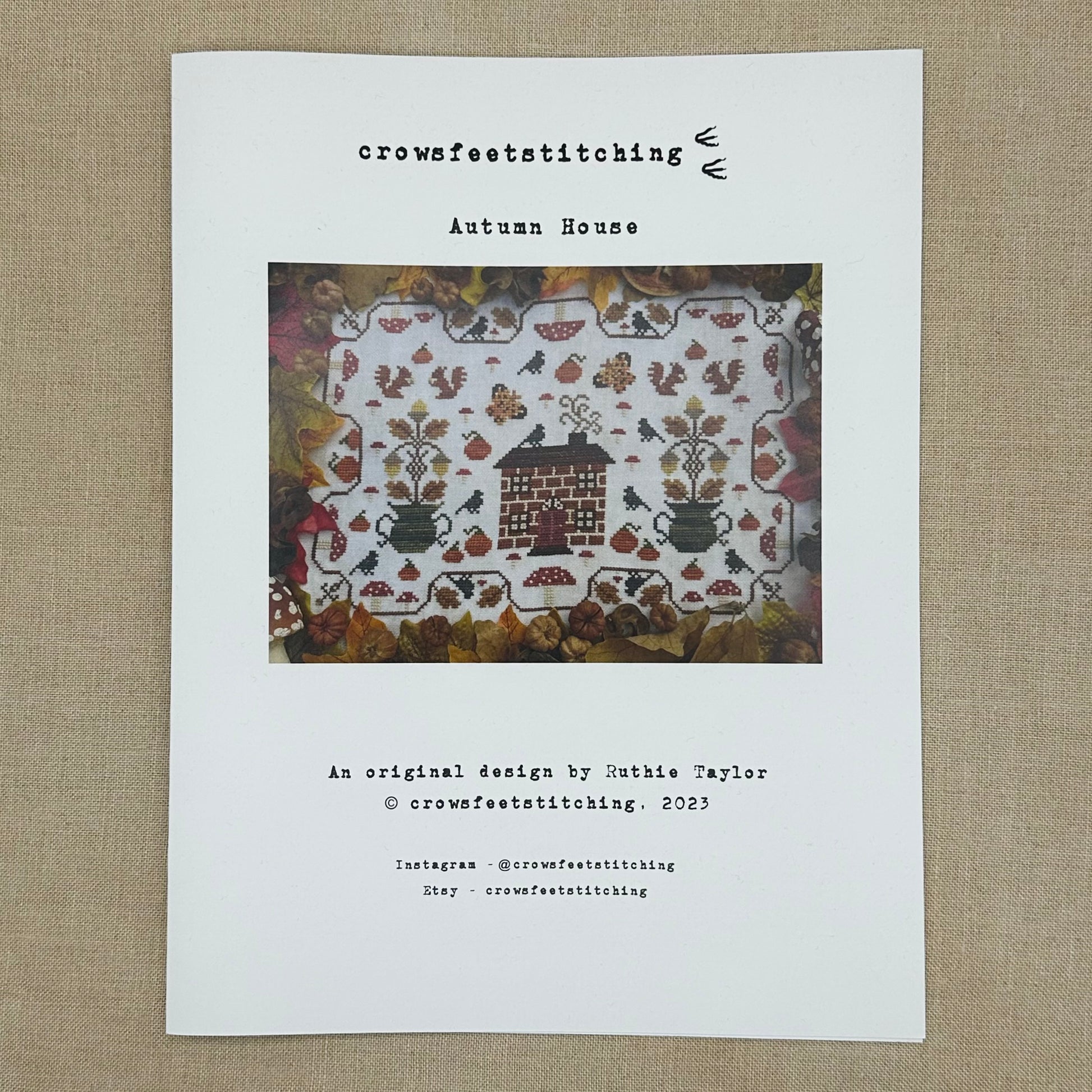 A physical booklet chart for crowsfeetstitching's design "Autumn House" with the option to add the Roxy Floss Co thread conversion done by Hannah (@flossbosshannah)