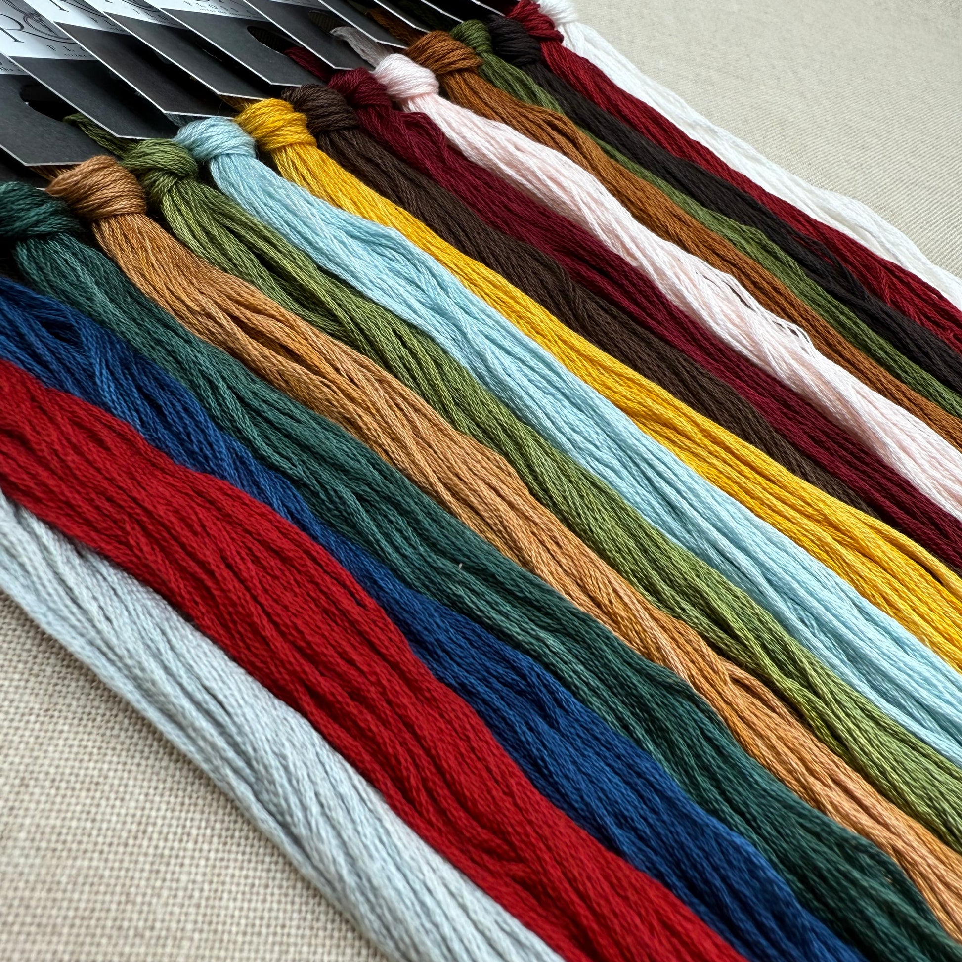 Floss colours included are: Pewter, Lucille, Just Navy, Yule Be Pine, Annie, Lawn & Order, Atlantic, Colonel Mustard, Chocolate Ganache, Sommelier, Pinky Promise, Autumnal, Turf, Brunette, Falu Red, and Legend-Dairy