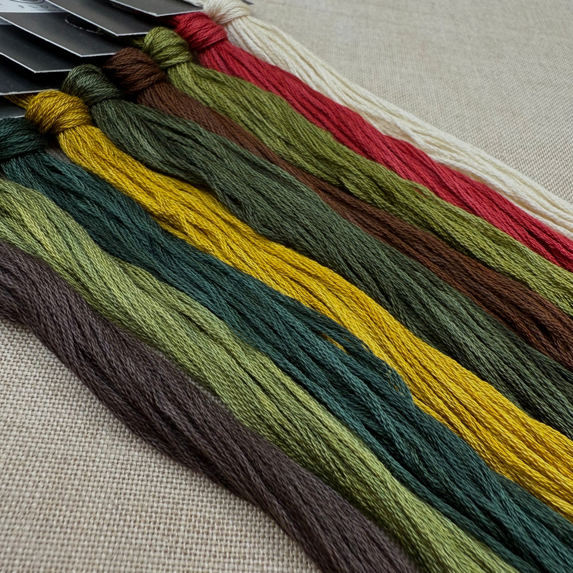 Floss colours included are: Truffle, Lawn & Order, Wicked, Sergeant, Deep Woods, Espresso, Pinery, Lipstick, Antique Wedding Dress