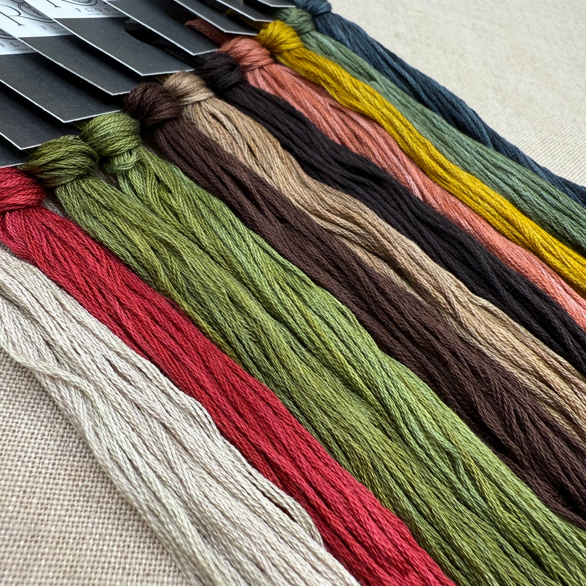 Floss colours included are: Desert Sand, Lipstick, Pinery, Lawn & Order, Chocolate Ganache, Demerara, Brunette, The Occasion, Sergeant, Fresh Cut, Seas the Day