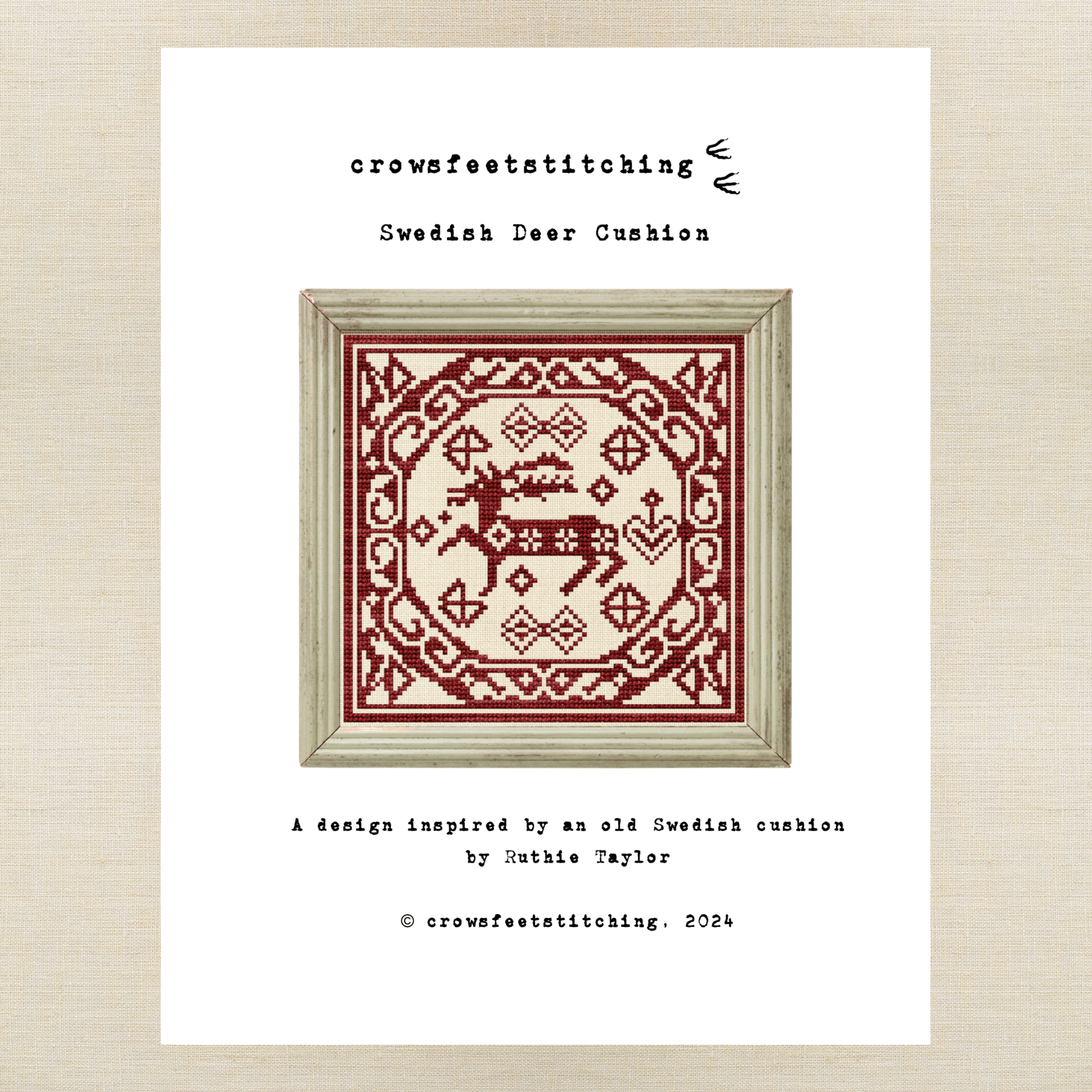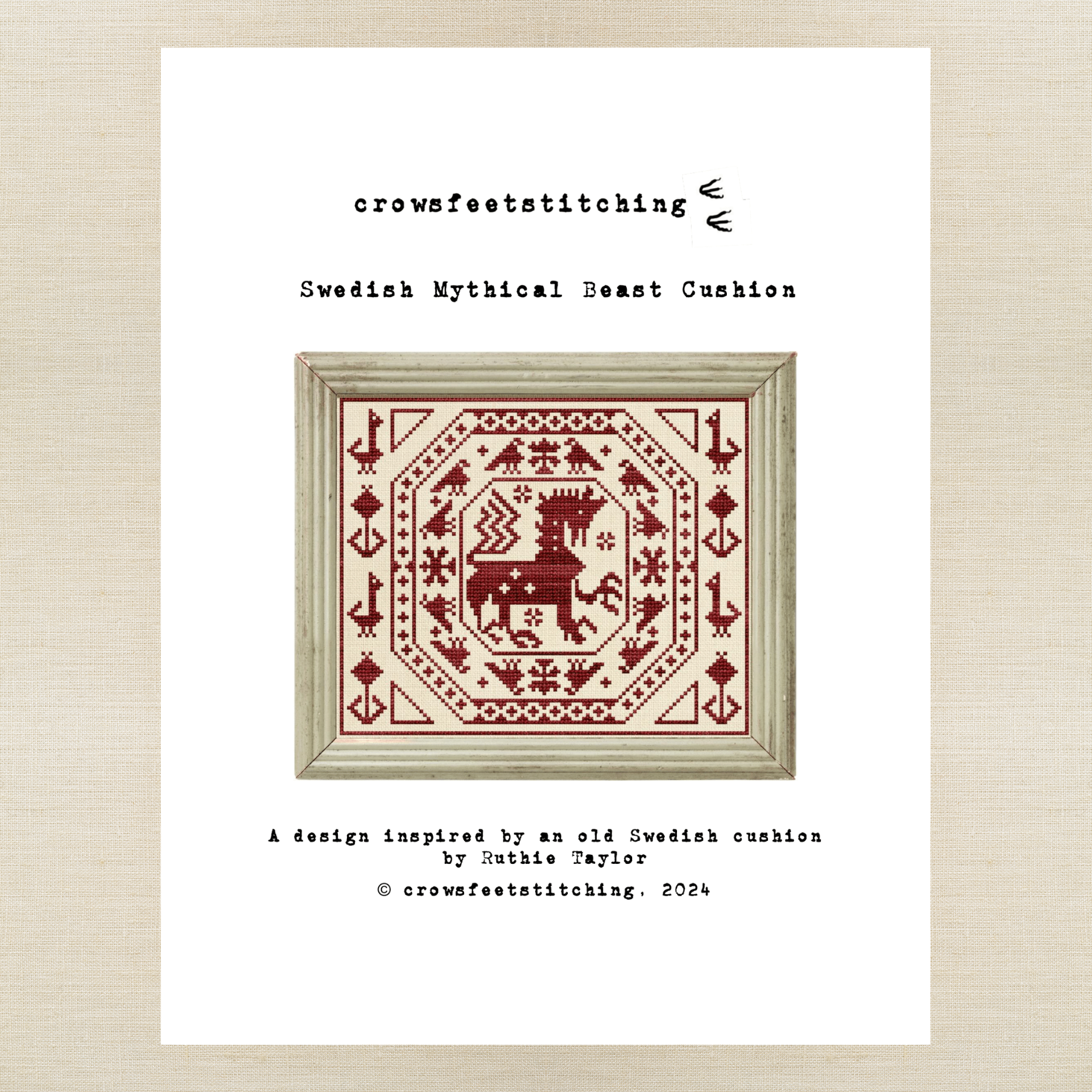 This item includes a physical chart for crowsfeetstitching's "Swedish Deer Cushion" AND "Swedish Mythical Beast Cushion" and/or a pack of the called-for Roxy Floss.