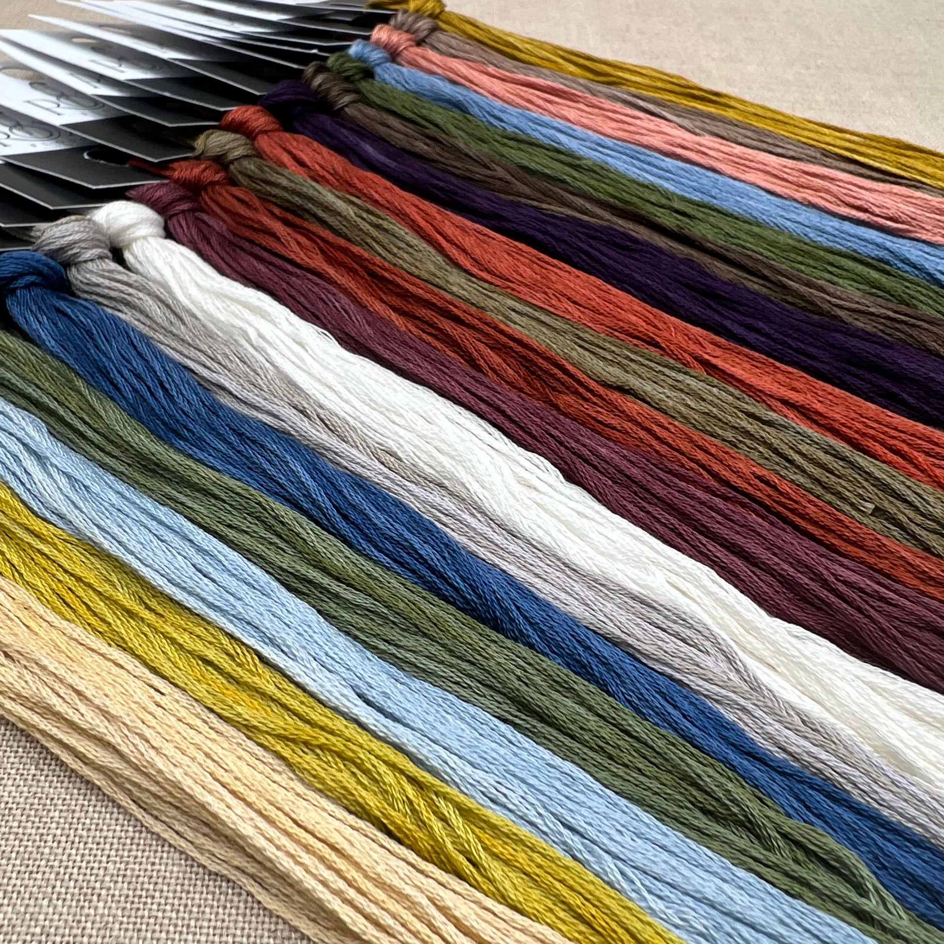 Floss colours included are: Straw Hat, Honey Mustard, Thin Air, Artichoke, Huron Time, Earl Grey, Legend-Dairy, Rule of Plum, Tart, Murkwood, Craisins, Over It, Muddy Trail, Asparagus, Ruddy Duck, Garden Party, Double Double, and Gold Star