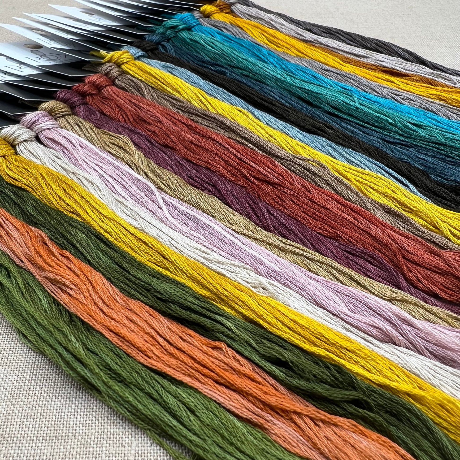 Floss colours included are: Lawn & Order, Under the Wire, Turf, Turmeric, Oyster, Prose, Chanterelle, Rule of Plum, Tart, Craisins, Demerara, Saffron, Gwyneth, Vierlande, Blue in the Face, Spruced Up, Tropical, Blue Raspberry, Spectre, Curry Powder, Gold Lang Syne, This Sand That, and Plum Shadow