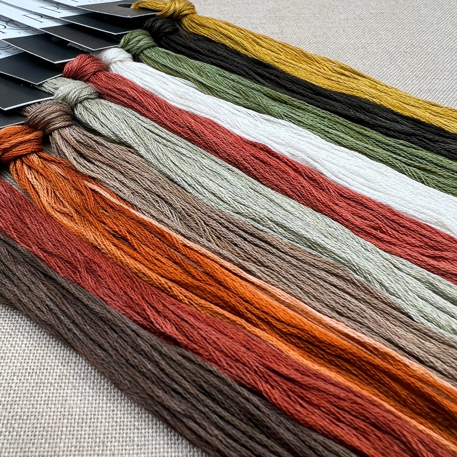 Floss colours included are: Muddy Trail, Rosewood, Gourd Vibes Only, Demerara, Evoo, Craisins, Betty White, Smells Like Money, Vierlande, and Butterscotch