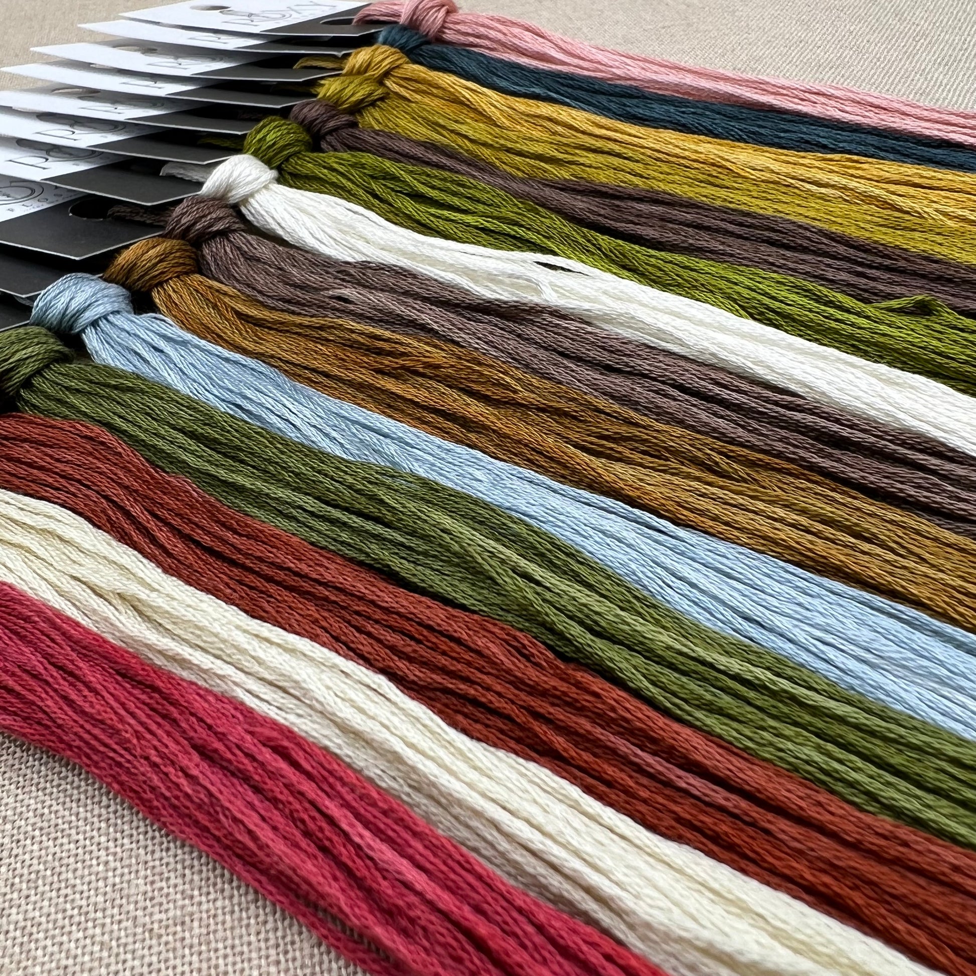 Floss colours included are: Raspberry Puree, Almond, Rosewood, Smells Like Money, Thin Air, Ochre, Hickory, Betty White, The Final Moss, Alder Ego, Serpent, Butterscotch, Blue in the Face, and Piggy Bank