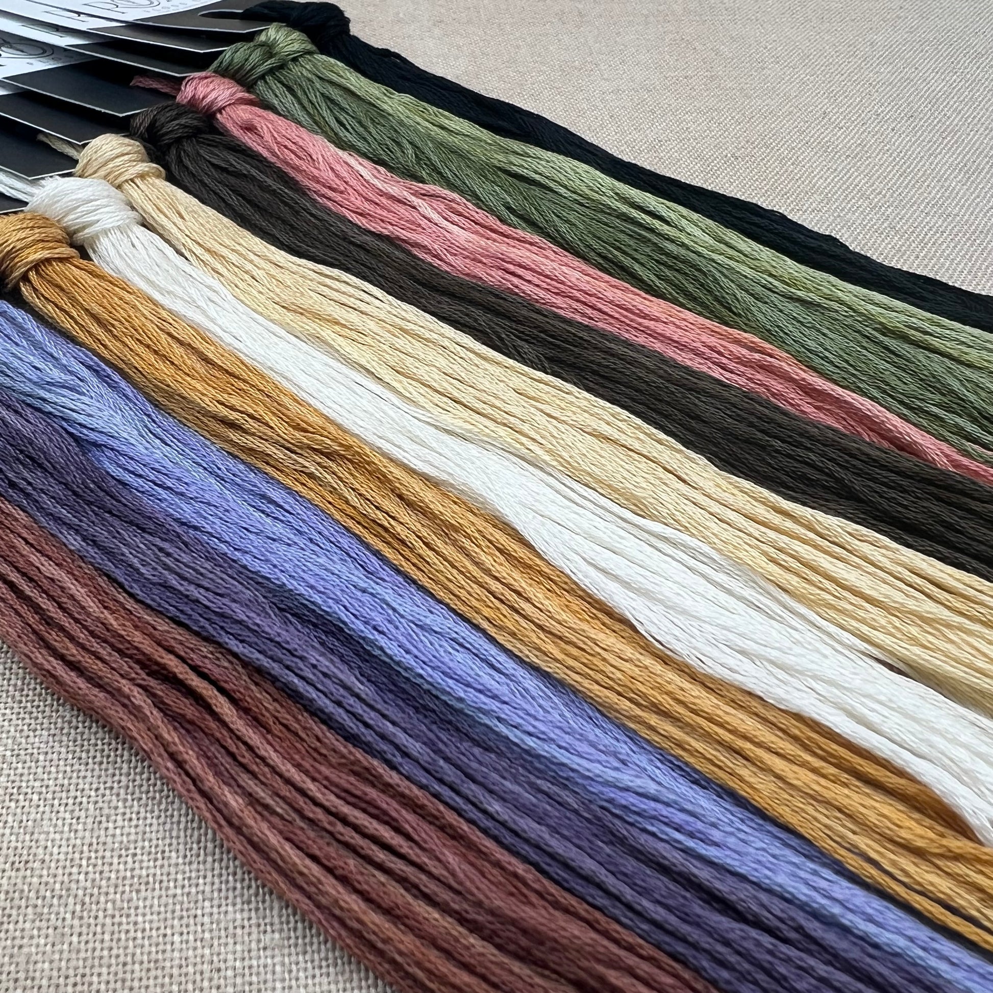 Floss colours included are: Frangelico, Violet Woods, Shy Violet, Hay Bale, Betty White, Straw Hat, Truffle, Oink, Artichoke, Arugula, and Charcoal