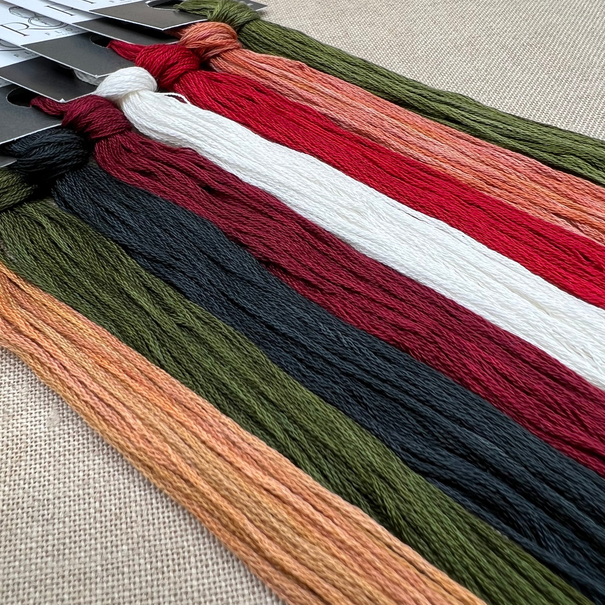 Floss colours included are: Ember, Spinach, Charcoal, Sommelier, Legend-Dairy, Lucille, Geranium, and Asparagus