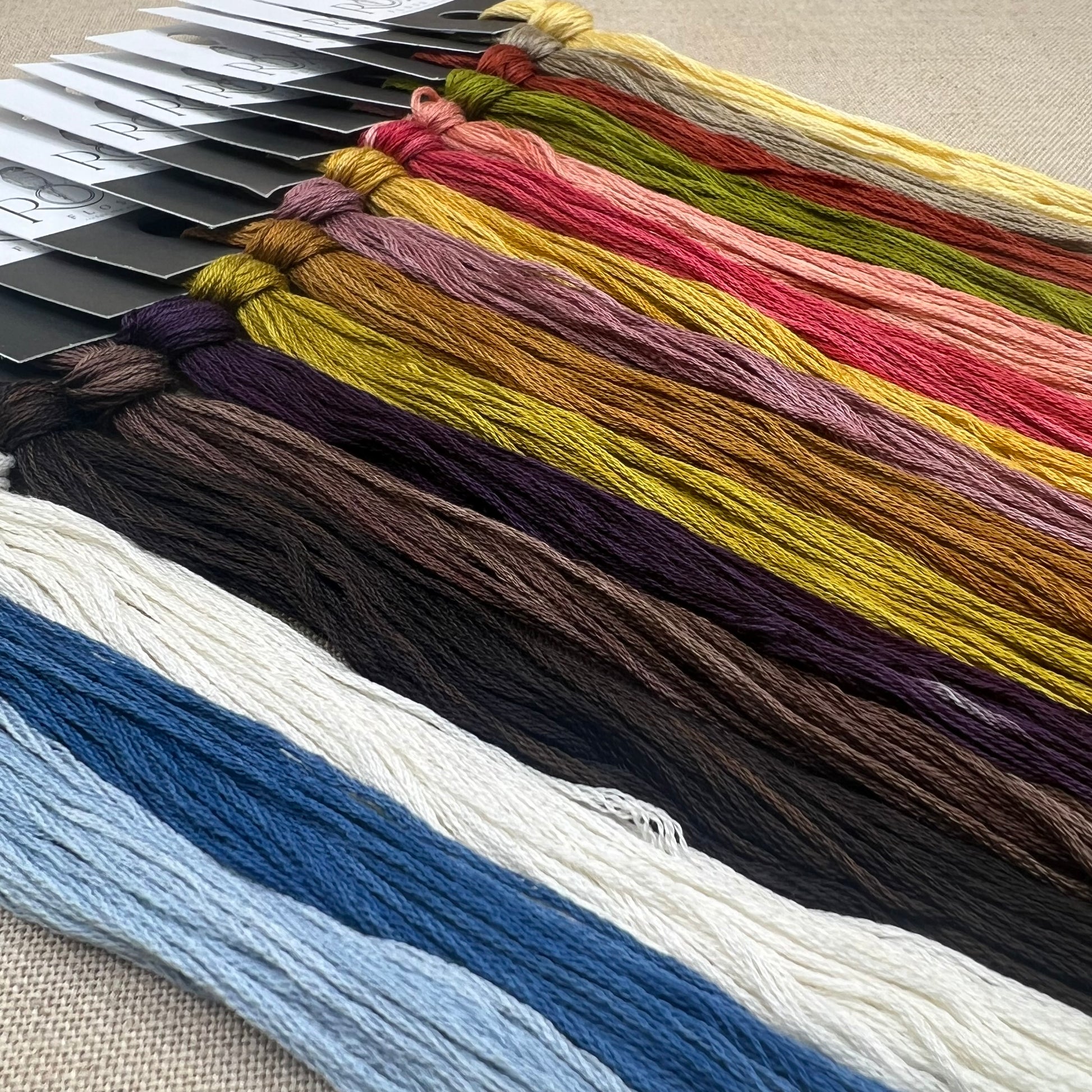 Floss colours included are: Thin Air, Huron Time, Betty White, Brunette, Alder Ego, Over It, Serpent, Ochre, Sugar Plum, Butterscotch, Raspberry Puree, Garden Party, The Final Moss, Rosewood, Cashmere, and Chick