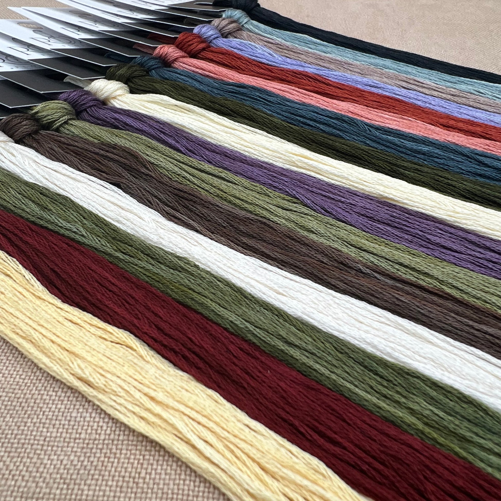 Floss colours included are: Chick, Chambord, Asparagus, Betty White, Truffle, Artichoke, Violet Woods, Daffodil, Spinach, Blue in the Face, Prima Donna, Rosewood, Shy Violet, Fossil, Gwyneth, and Charcoal