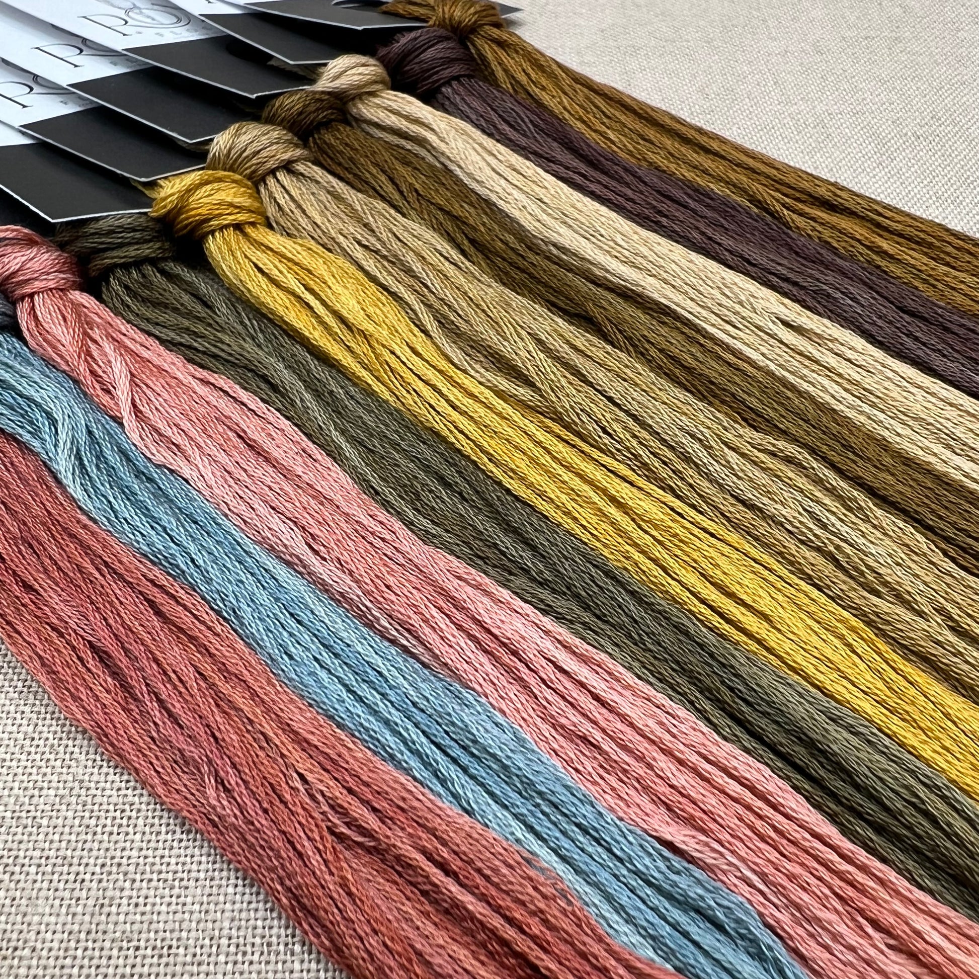 Floss colours included are: Chili Powder, Gwyneth, Garden Party, Dirty Martini, Butterscotch, Chanterelle, Umber, Porcini, Alder Ego, and Ochre
