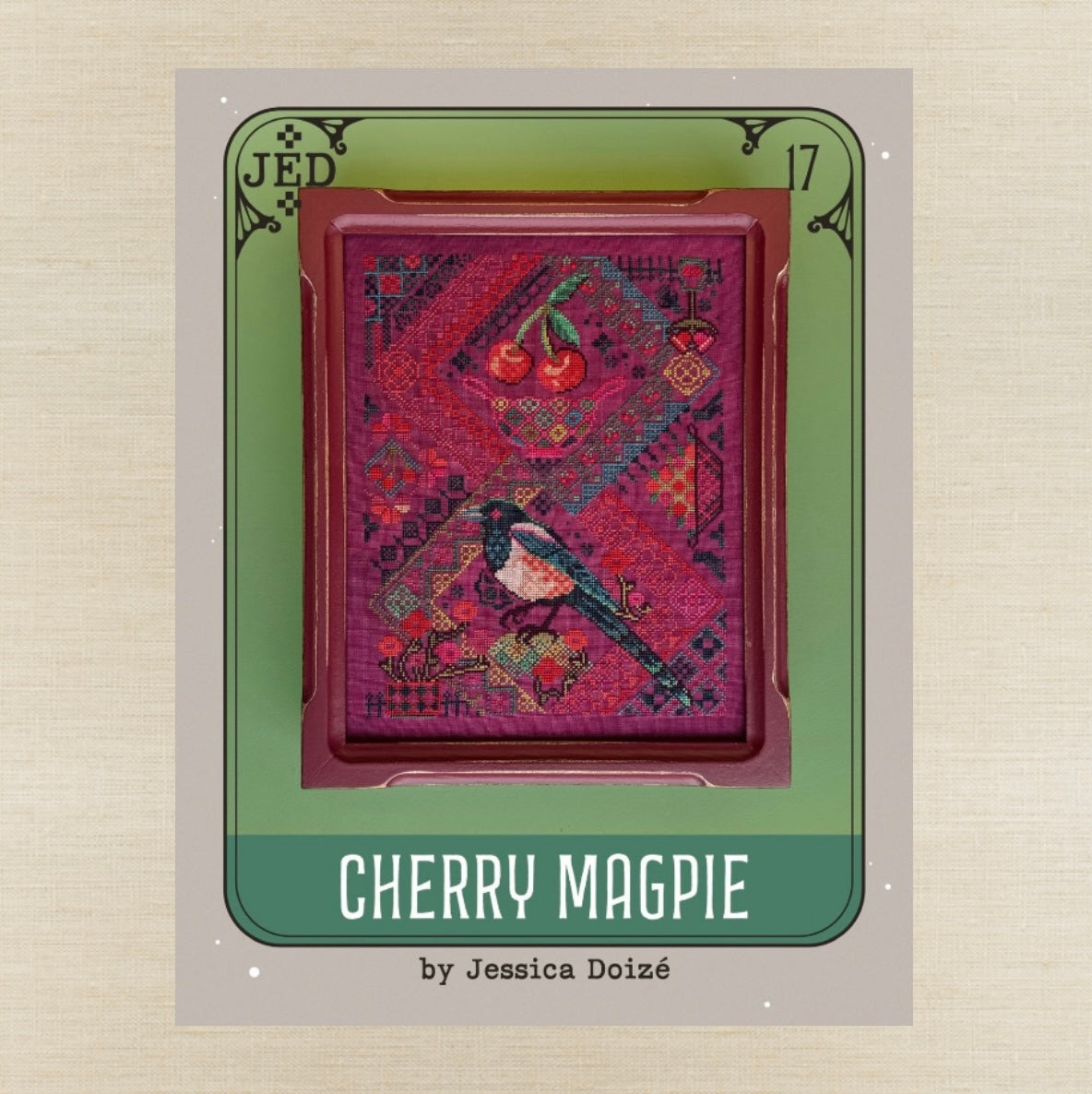 This item includes a physical booklet chart for JEDxStitch's "Cherry Magpie" and/or the Roxy Floss Co thread conversion done by Kerri (@roxy.flossco)