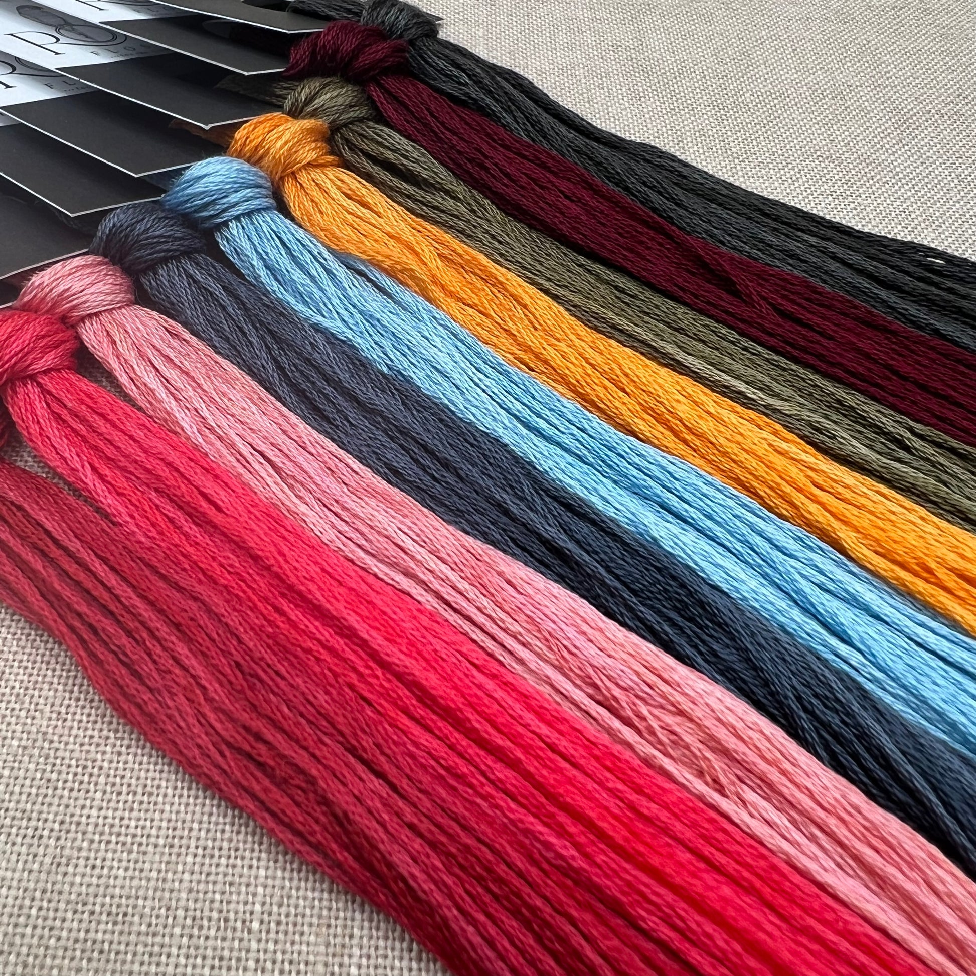 Floss Colours Included: Camping Trip, Peach It (Sistah), Lead It Be, Bluebird, Dirty Martini, Starburst Cherry, Sommelier, Monarch, and Cheeky
