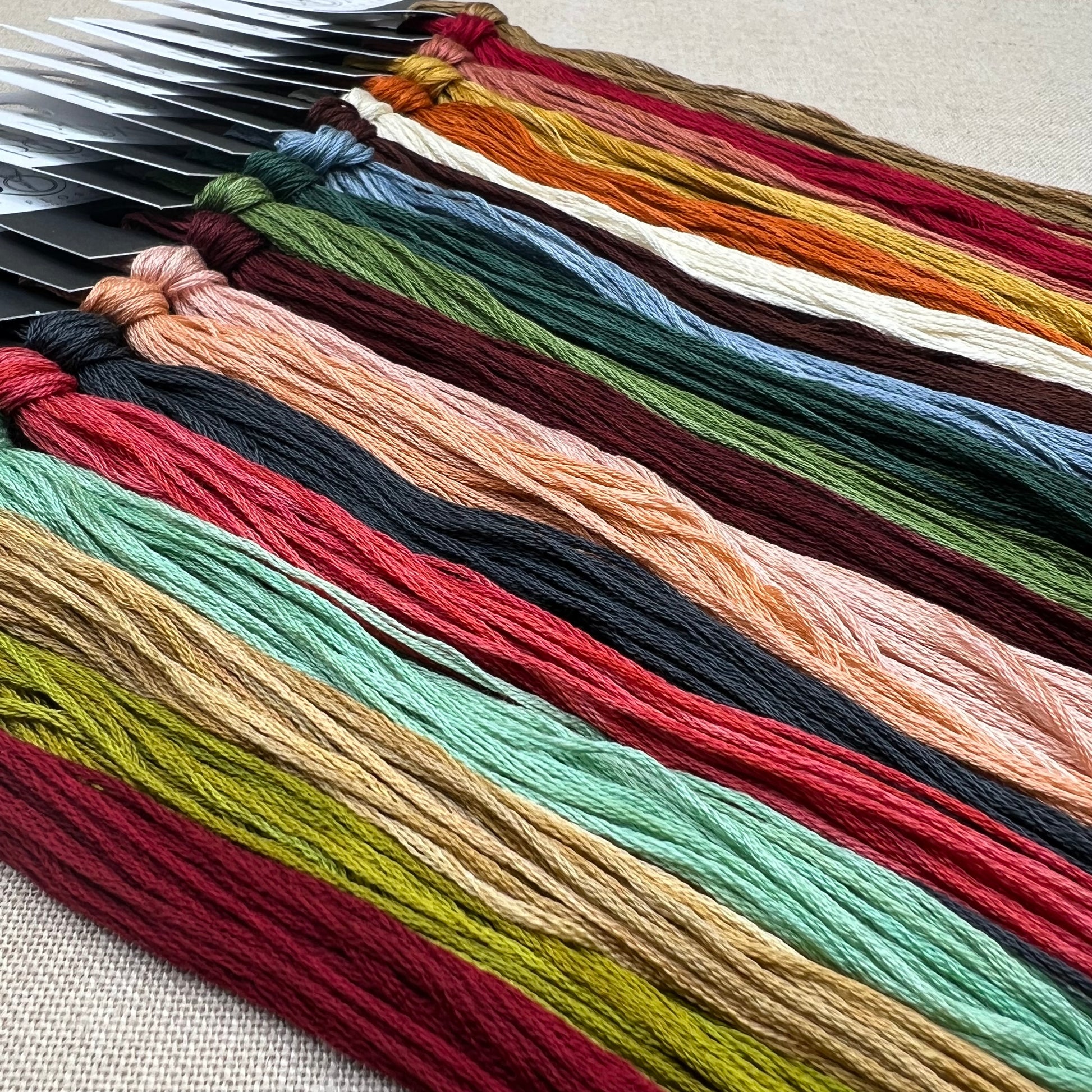 Floss colours included are: Falu Red, Monstera, Creme Brûlée, Spa Day, Solitude, Coal, Smoothie, Salmon, Chambord, New Leaf (x2), Yule Be Pine (x2), Honeymoon, Redwood, Antique Wedding Dress, Butter Chicken, Butterscotch, Chili Powder, Lucille, and Caramel