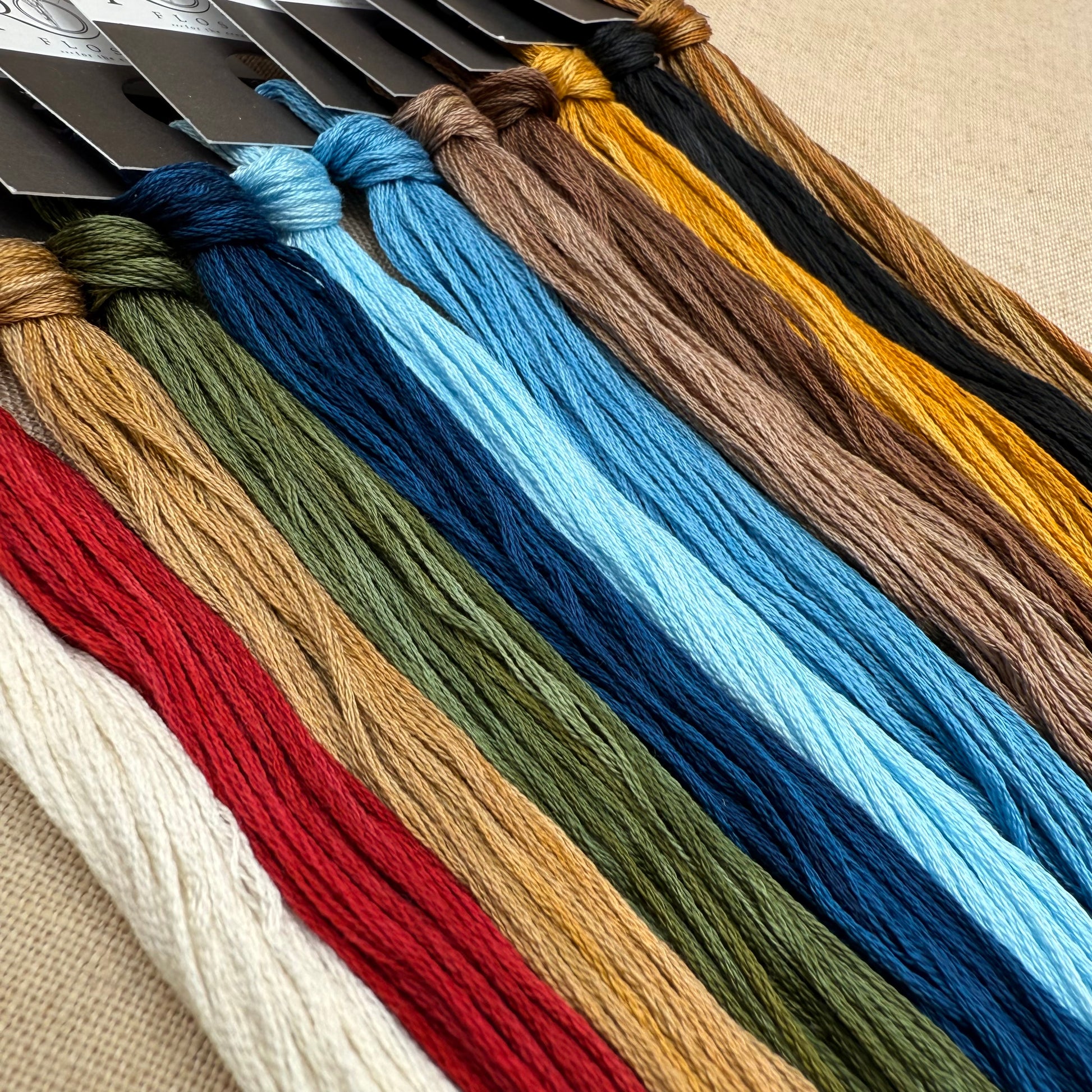 Floss colours included are: Betty White, Lipstick, Chanterelle, Juniper, Stellar, Robin's Egg, Flock Party, Double Double, Milk Chocolate, Butterscotch, Charcoal, Caramel