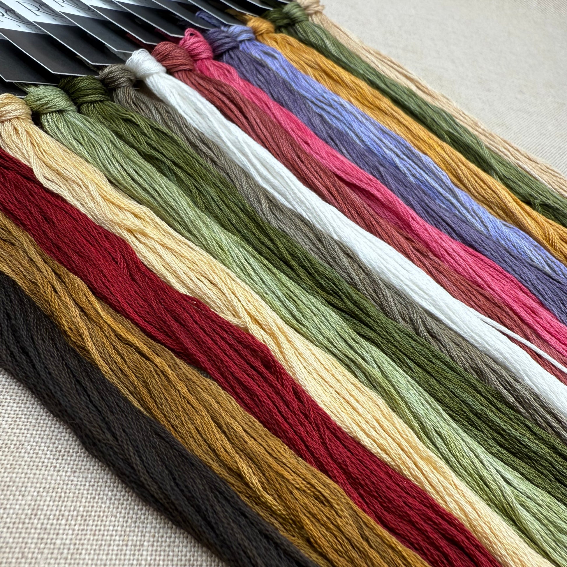Floss colours included are: Baker's Block, Ochre, Falu Red, Straw Hat, Arugula, Asparagus, Morel, Legend-Dairy, Berry Queen, Knockout, Violet Woods, Shy Violet, Hay Bale, Spinach, Artichoke, Sand Dollar