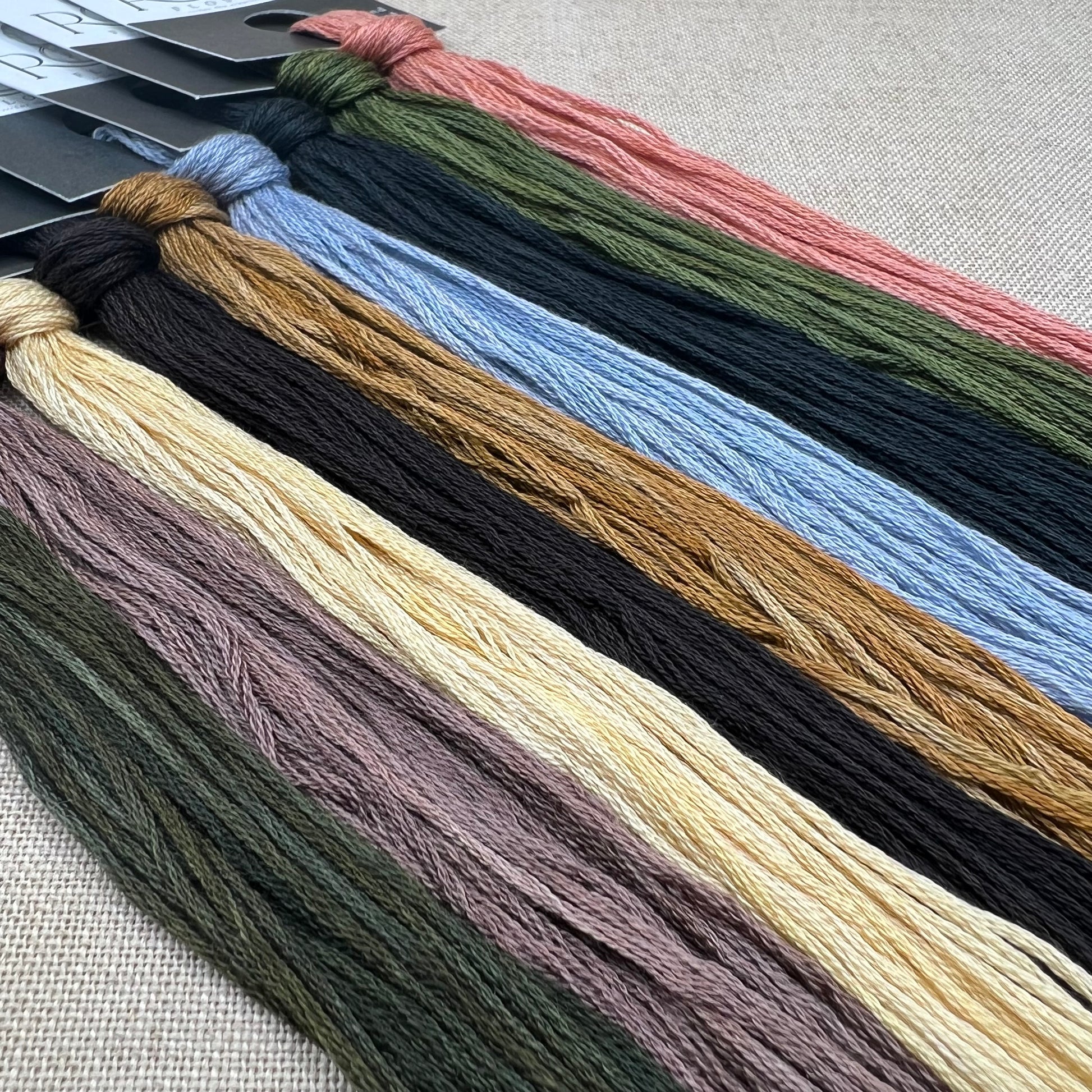 Floss colours included are: Dark Sage, Hickory, Straw Hat, Baker's Block, Caramel, Steel, Charcoal, Asparagus, and Garden Party