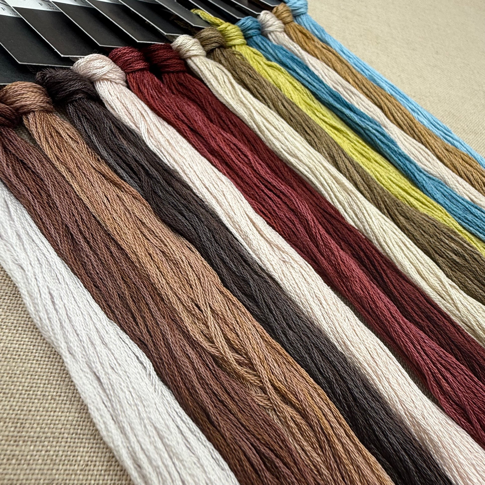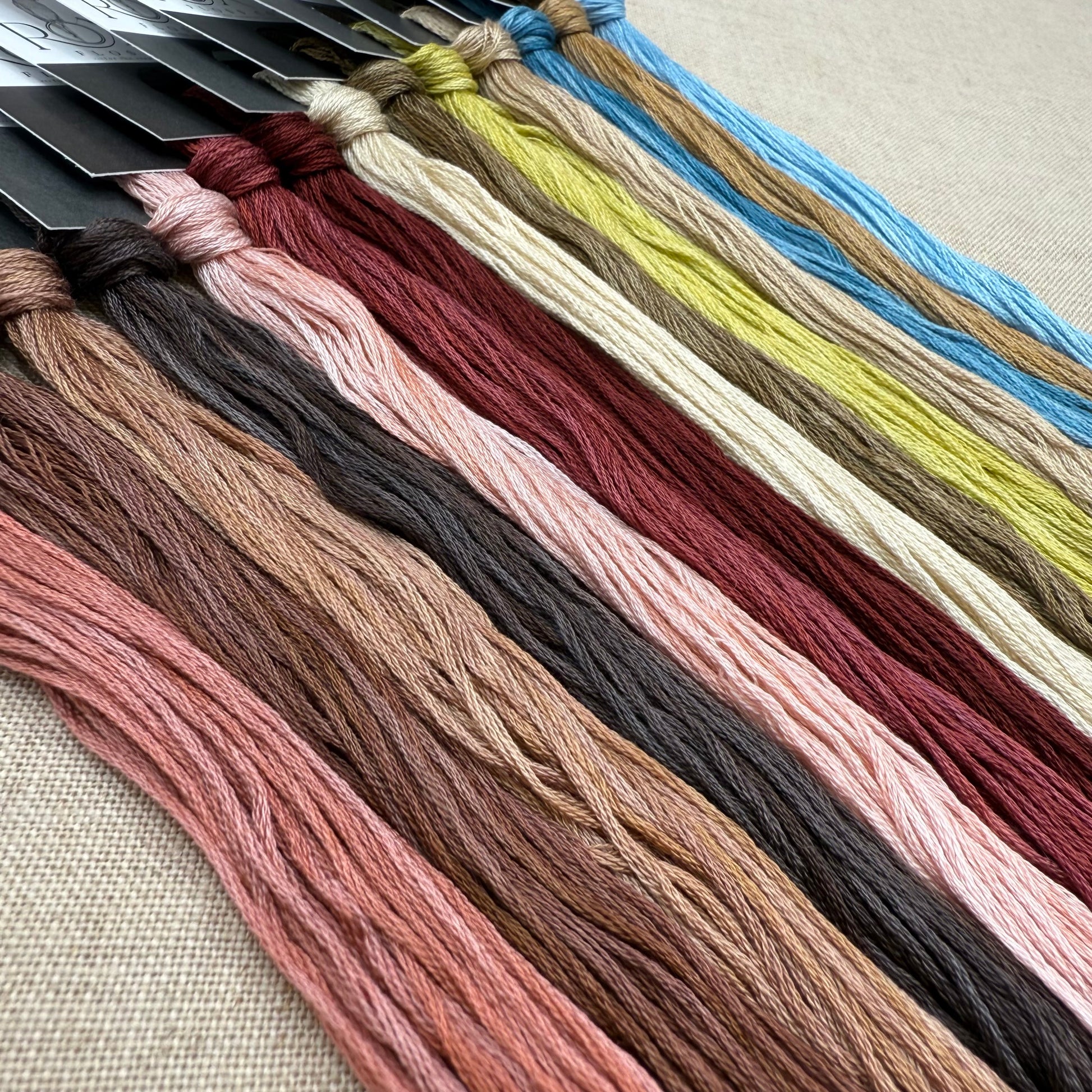 Floss colours included in the dark colourway (to be stitched on Powderpuff) are: Prima Donna, Kahlua, Amaretto, Truffle, Piglet, Pippy, Chambord, Neut, Murkwood, Nerdy, Make a Splash, Oat-rageous, Chanterelle, and Bluebird