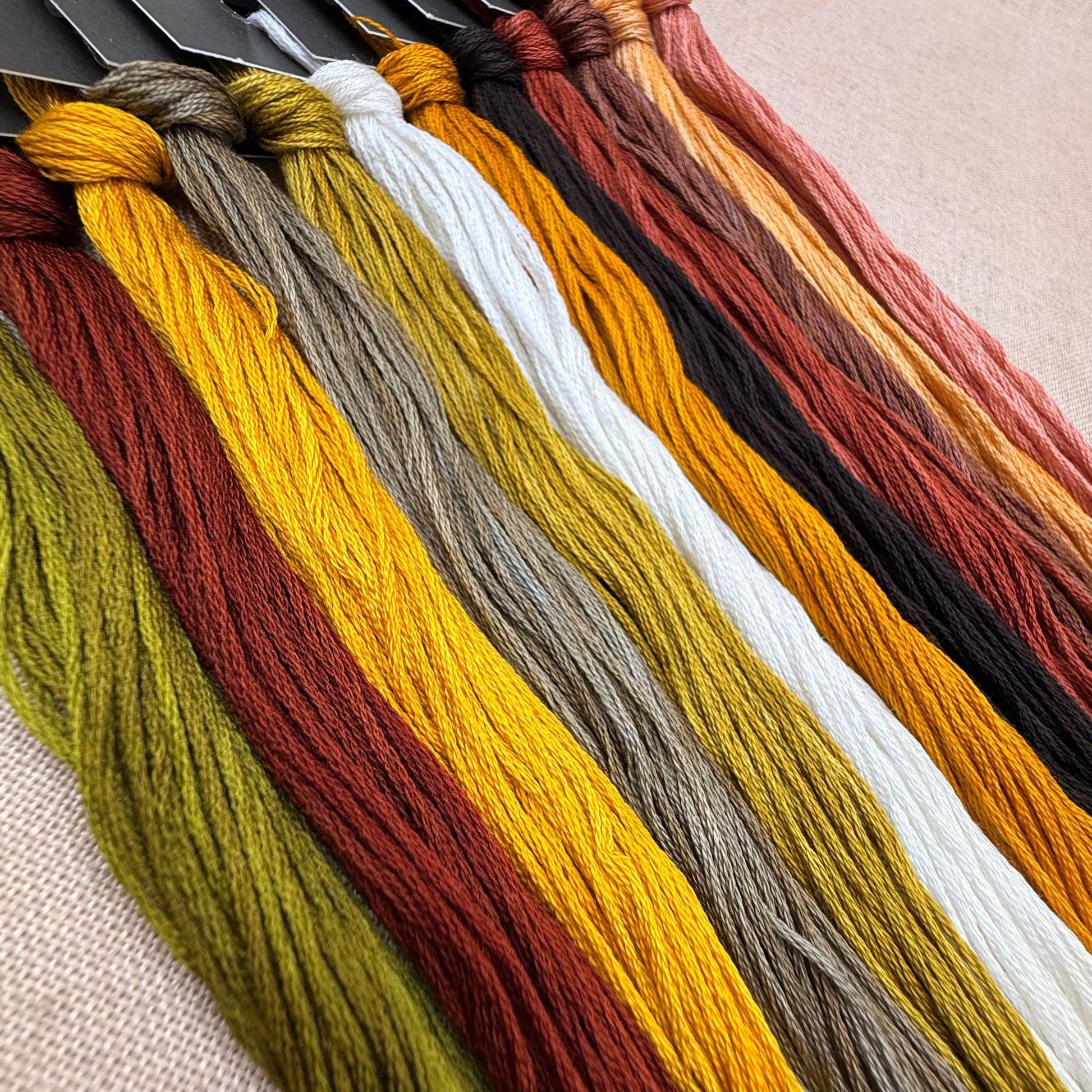 Floss colours included are: The Final Moss, Mums the Word, Turmeric, Murkwood, Serpent, Legend-Dairy, Curry Powder, Brunette, Tart, Kahlua, Hive Mind, Garden Party