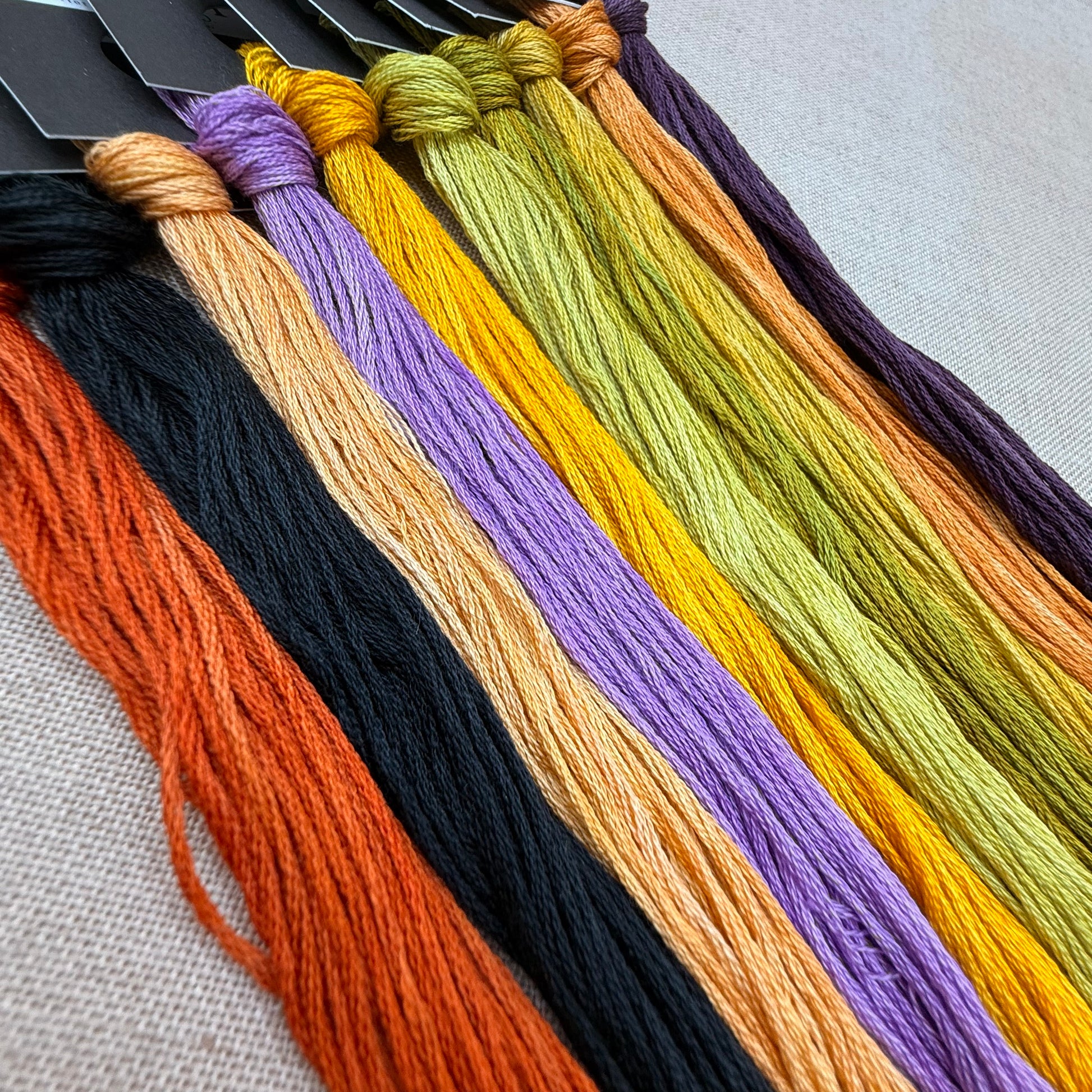 Floss colours included are: Clownfish, Charcoal, Hive Mind, Amethyst, Saffron, Peas & Love, Monstera, Verd's the Word, Lady Marmalade, Royalty Free