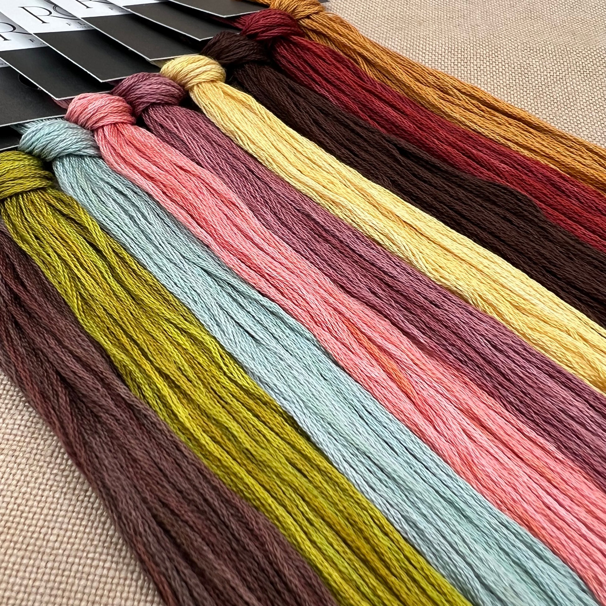 Floss colours included are: Alder Ego, Monstera, Cool Breeze, Oink, Sugar Plum, Sunshine, Chocolate Ganache, Pippy, and Nobel