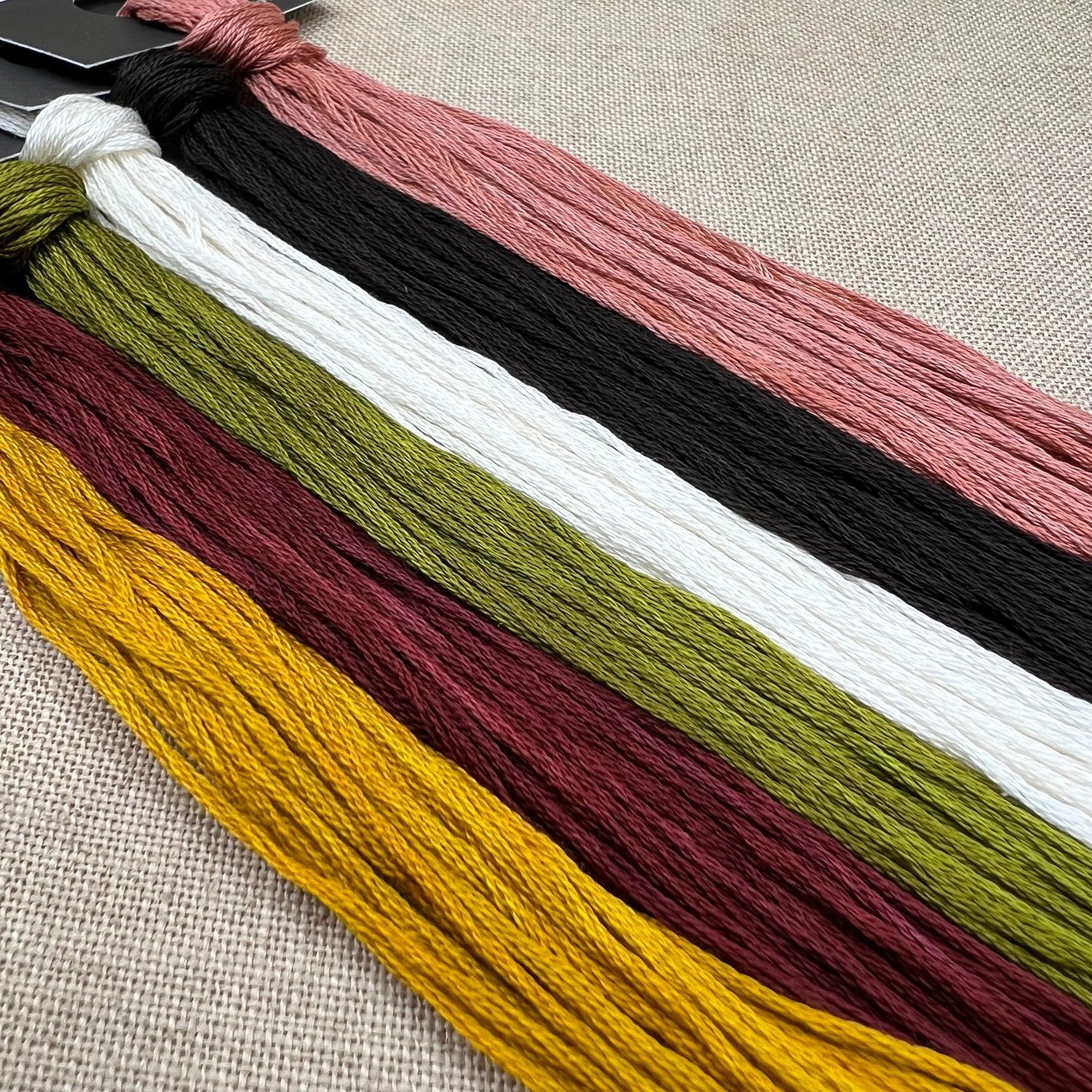 Floss colours included are: Curry Powder, Chambord, The Final Moss, Betty White, Backer's Block, and Prima Donna