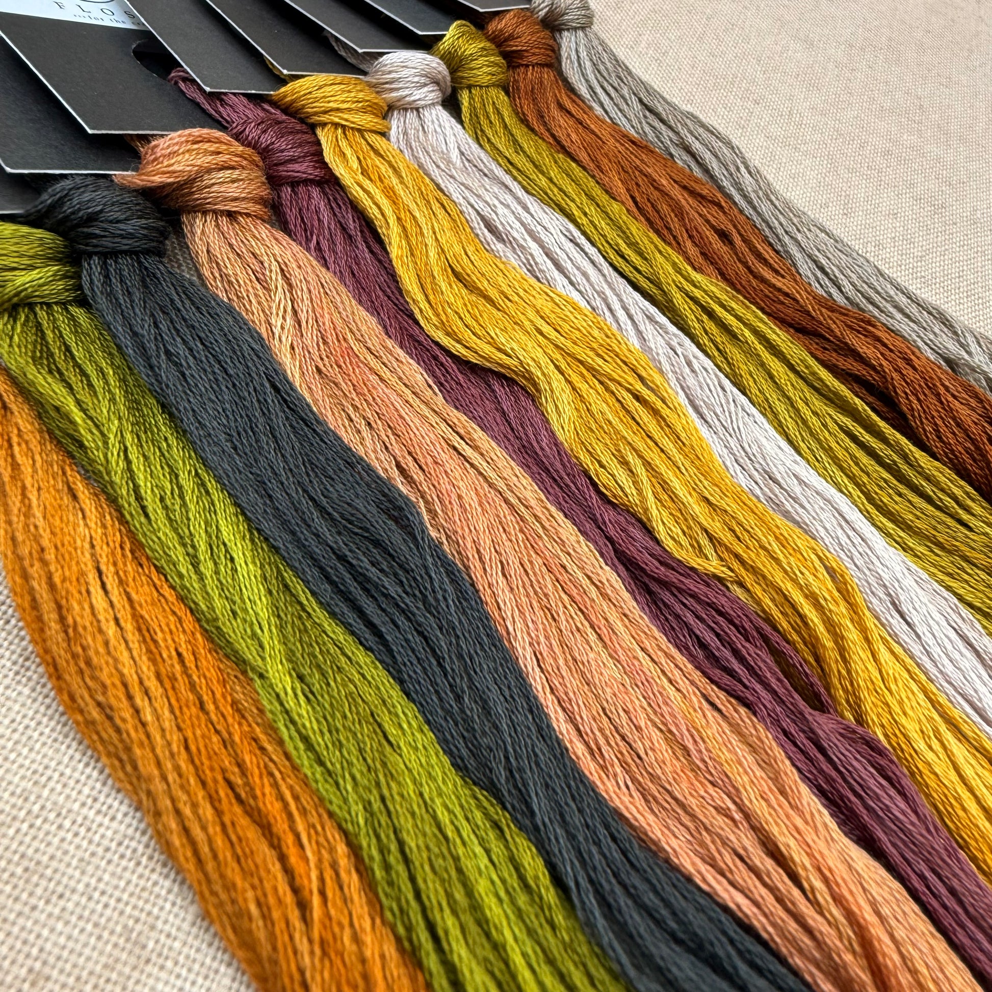 Floss colours included are: Fireside, The Final Moss, Carbon, Ember, Rule of Plum, Butterscotch, Pop(lar) Music, Serpent, Autumnal, Fossil