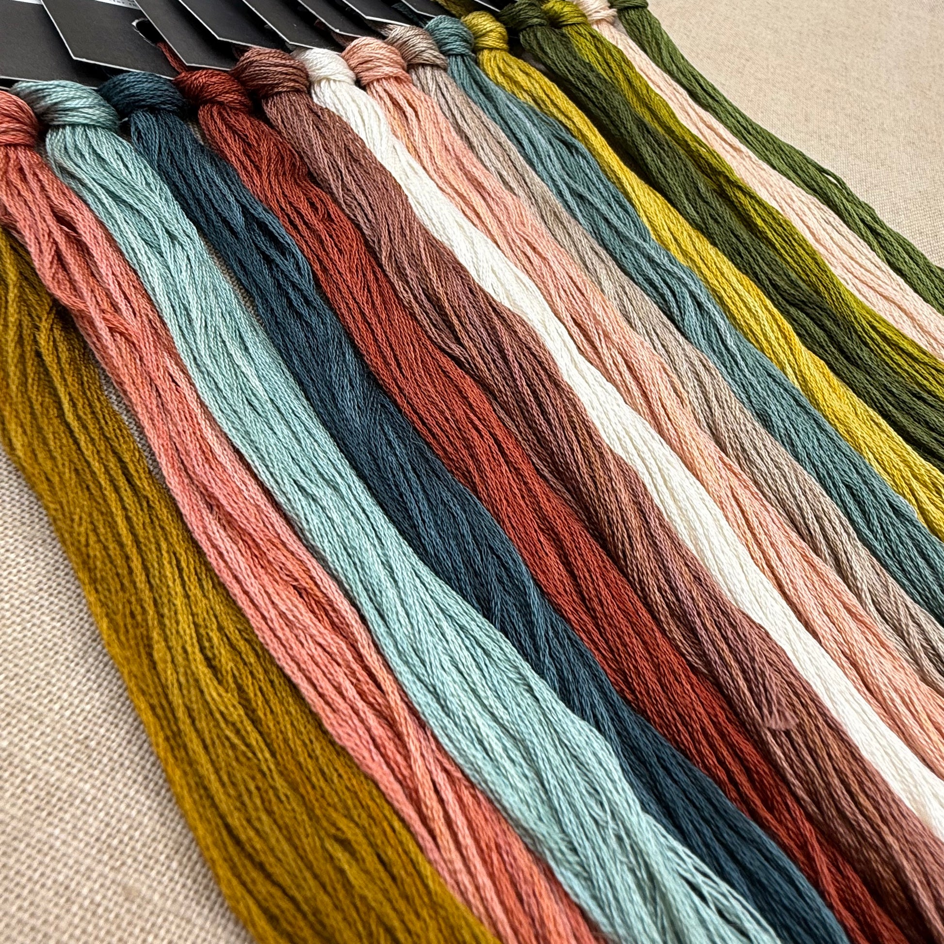 Floss colours included are: Mustardseed, Geranium, Whistler, Blue in the Face, Tart, Frangelico, Betty White, Salmon, Cobblestone, Teal or No Teal, Honey Mustard, Turf, Monstera, Moscato, Lawn & Order