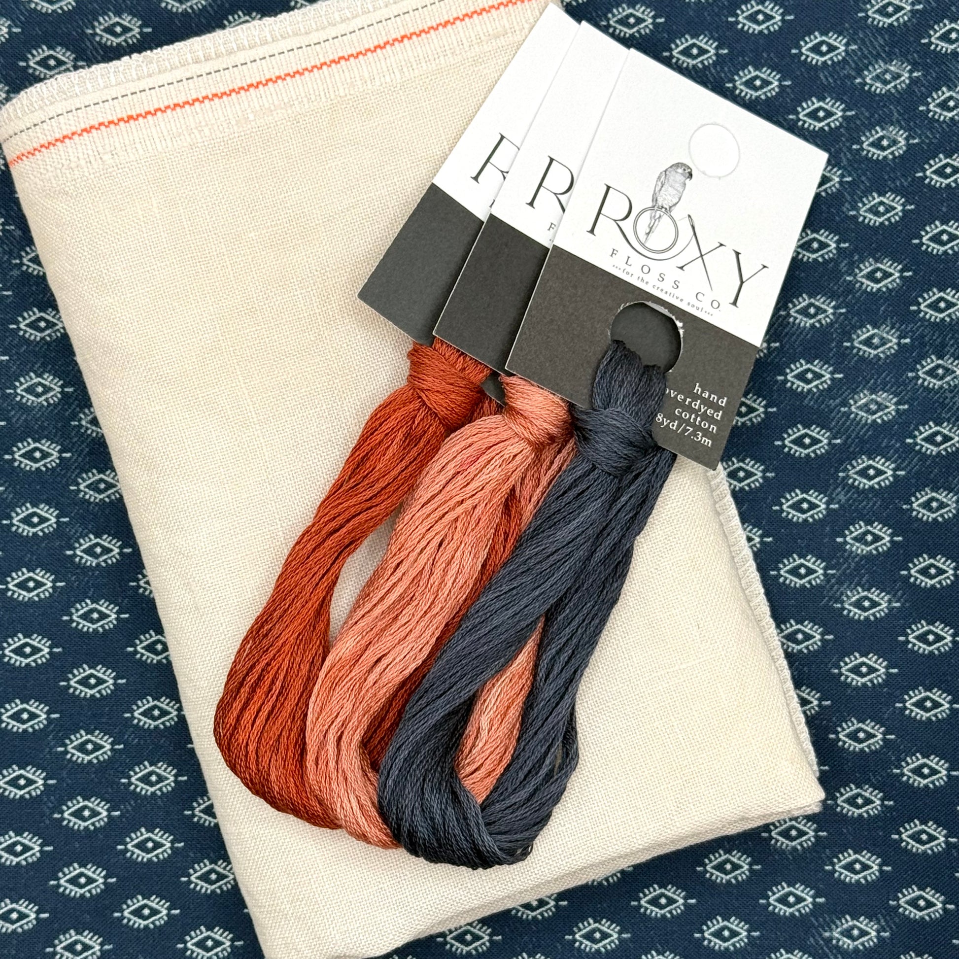 This item does not include linen/aida. Our suggestion for this project is Roxy Floss Co Porcelain, which is available in linen here, aida here, and evenweave here.