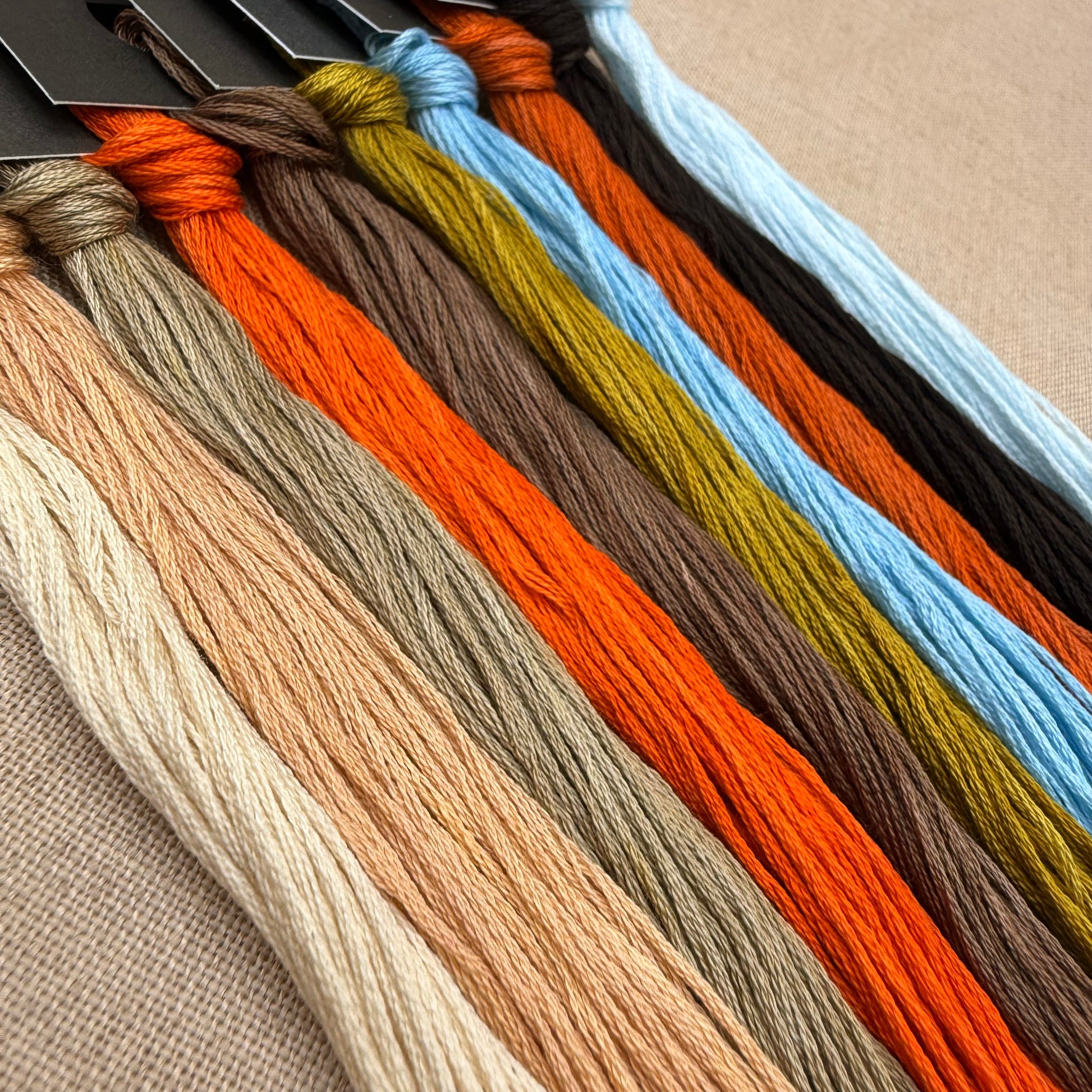 Floss colours included are: Antique Wedding Dress, Macaroon, Cashmere, Wascally Wabbit, Carob, Serpent, Bluebird, Butter Chicken, Baker's Block, Iceberg
